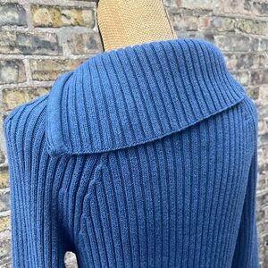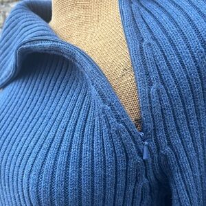 This is a great chunky knit sweather by Carole Little that features a diagonally zipping adjustable neckline. It is thicker, made with ribbed 100% cotton, in a pretty blue. Fantastic condition Like new. Size Large