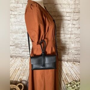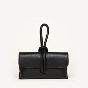 M Gemi The Francesca purse to crossbody this twist on a envelope silhouette with tubular strap that loops around your wrist removable strap tumbled leather soft calf leather made in Abruzzo Italy 22”w 11”h 5”d color black like new