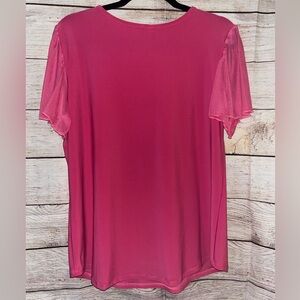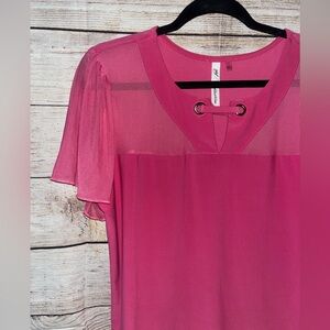 NY Collection chic fuchsia blouse with a neckline detail. Features flutter sleeves and a sheer yoke. Perfect for versatile styling.