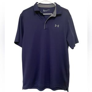 Under Armour men’s performance polo shirt in navy blue with gray collar detail.