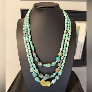 These are all turquoise (and accent 925 beads thrown in there)! The beads range in size but are around 11x6mm. There are larger polished beads in the front. The necklace is about 18" long. The next strand is 20" and the final strand is 22".
