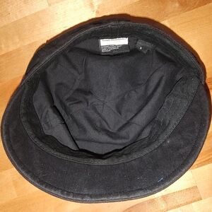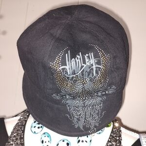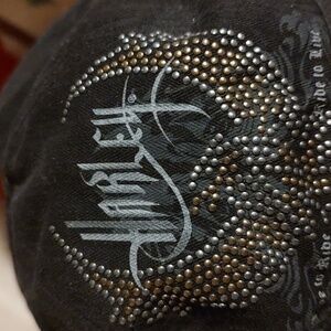 Harley-Davidson Ladies cotton small brimmed black hat with embellished eagle. No damage to fabric. No tear or holes. Enjoy! Photos may appear that it's gray, but, it is black.