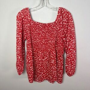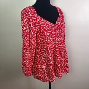 LOFT Petites Red White Heart Print Smocked Square Neck Long Sleeve Top Size 6P