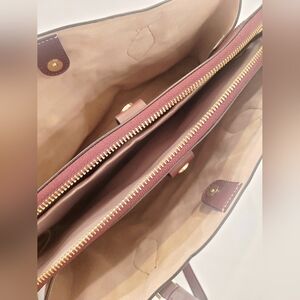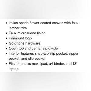 Chic tote with spade floral pattern. Spacious and stylish. Perfect for daily use. Open top and center zip divider. Interior features snap-tap slip. Double handles with a drop of 11".