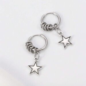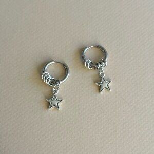 Elegant silver hoop earrings featuring a charming star design. Perfect for adding a touch of sparkle to any outfit.