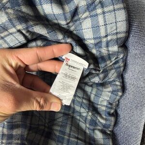 Stylish Supreme denim jacket in light wash. Features a hood and front pockets. Ideal for casual outings.