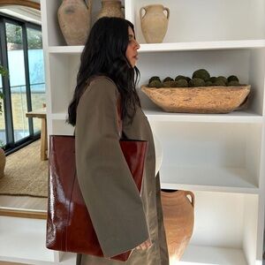 New with tag large tote patent leather purse from Sézane. I wanted more of a dark chocolate brown color bag, but this is more reddish brown in person. Sézane website indicate it’s chocolate brown, but almost burgundy red in person. Can fit a laptop and more in the bag. Comes with the orignal dust bag,
