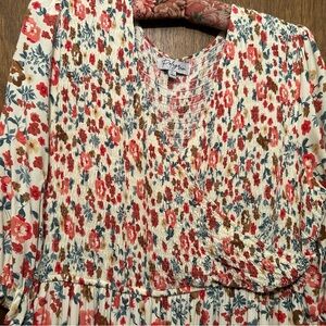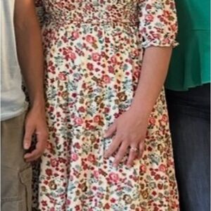 Chic floral midi dress by Polagram. Features vibrant red and blue flowers. Perfect for any occasion. 41” length shoulder to hem, and 15” waist unstretched. Fits true to size, but also has plenty of give. I’d sat it fits anywhere from size 12-16. Nursing friendly.