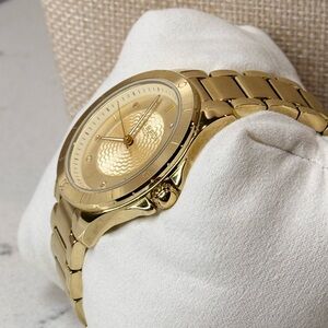 “Sports Luxe gets an elegant twist with the Swirled Watch. Inspired by the ocean, this ‘wave’ texture dial has a light reflecting finish. The domed bezel, chunky case and 3-link bracelet strap lend a sporty, oversized feel. With a classic gold finish and tonal Gold dial, Swirled is stylish, relaxed and always on point.”