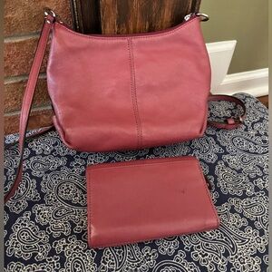 This set features a beautiful, soft-pleated leather hobo shoulder bag with a matching fold-over snap wallet in a rich berry/plum pink color. The leather is soft and luxurious, and the set is a timeless addition to any wardrobe.