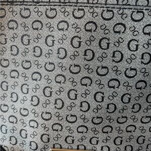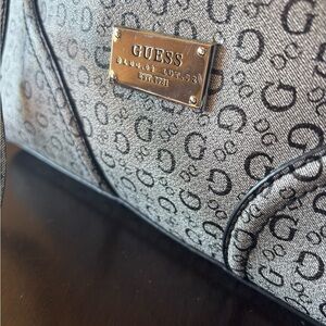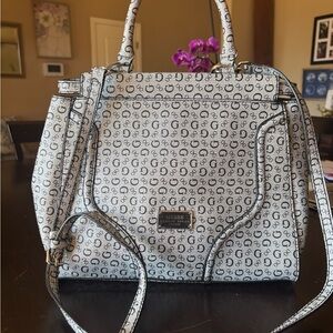 Chic Guess satchel with iconic monogram pattern. Features a sleek black and white design. Perfect for everyday elegance.