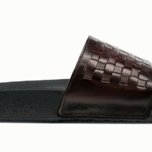 Elegant dark brown slides with woven design. Ideal for relaxed style and comfort.