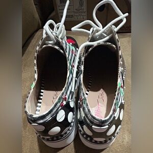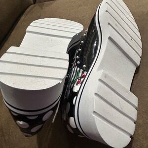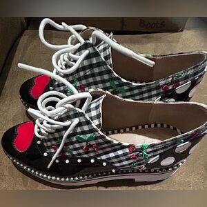 New Women’s size 7 M Chic platform loafers featuring a black and white checkered design with cherry accents. Red accents of hearts and faux pearls add a bold touch. Perfect for a trendy look and for Valentine’s Day.