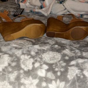 Chic brown suede wedges with adjustable straps. Stylish and comfortable for any outing. Can fit 6.5 to 7. But I am a size 6 and they fit.