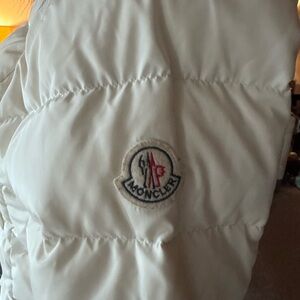 Preloved cream puffer jacket by Moncler. Features a stylish brown faux fur hood. Ideal for cold weather. I bought this second hand and not was Missing the belt but honestly this style looks better without it … the fur on the hood is detachable for a different look - no stains and zippers work great … grab this one!