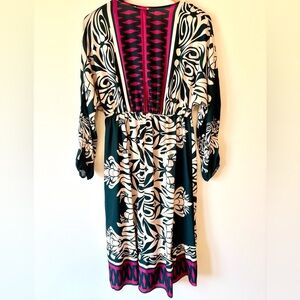 NWT Originally purchased in San Sebastián, Spain. Fabric is 100% viscose, light weight. Feels like a size 10-12 although not formally indicated anywhere on the garment. More than a three quarter sleeve, but not quite long sleeve. The small, skirted ruffle at the bottom and braided tassels add cute accent and charm! Measures 44” in length; 19” underarm to underarm.