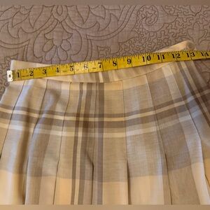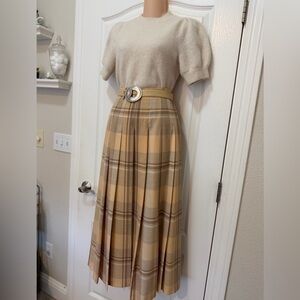 Beautiful cream beige tan plaid pleated wool skirt from Pendleton. 100% virgin wool. Midi to ankle maxi length. Light academia asthetic. This 50 year old piece is in very nice vintage condition with the exception of some tiny moth holes. There is one pinhole on the lower front, one on the right hip, and two right together on the lower back. They are hard to spot and stay hidden under the pleats. The one on the side is not under a pleat, but very tiny. Please see the last three pictures.