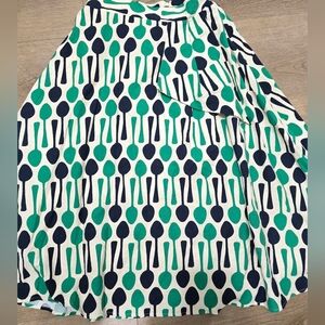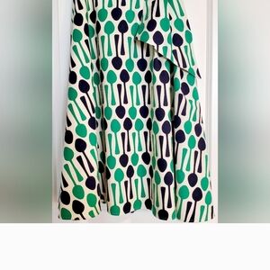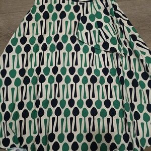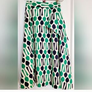 Bold asymmetrical skirt by Eva Franco. Features a striking green and blue pattern. Perfect for adding flair to your outfit.