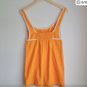 Stylish orange sleeveless dress featuring white trim and button details. Perfect for summer outings.
