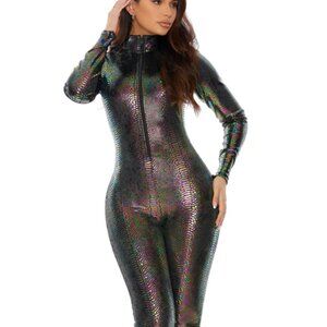 Black Zip front Reptile Women Jumpsuit - Slither into the spotlight with this captivating Black Zip Front Reptile Women Jumpsuit! With its striking design and convenient zip front closure, this costume is perfect for unleashing your wild side at any event. Just add your favorite pair of shoes to complete the look and prepare to turn heads wherever you go