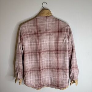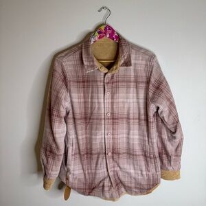 This is a unique Reversible Corduroy and Fleece Plaid Jacket. Stay stylish and warm with this brown corduroy button-up jacket. Perfect for layering, this jacket offers both comfort and a chic look. The Corduroy side has two functional breast pockets and the plaid side has two pockets down near the waist line that are functional. There are buttons on both arms in case you want to roll the sleeves up.