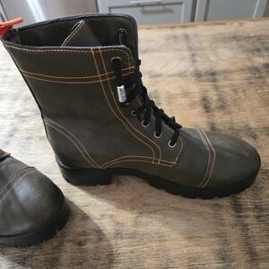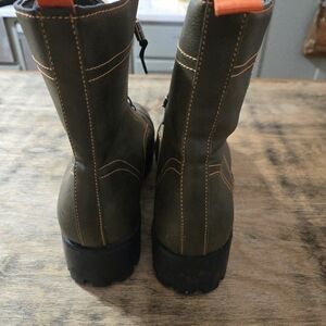 Trendy lace-up dark green boots with striking orange stitching. Perfect for a bold look. EUC elastic laces with cinch grommets