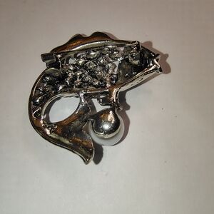 Charming vintage fish brooch featuring shimmering rhinestones, rich enamel accents, and a luminous faux pearl detail. The sculptural design combines silver-tone and gold-tone finishes for eye-catching contrast and sparkle. A whimsical yet elegant statement piece that adds personality to jackets, scarves, blazers, or handbags.