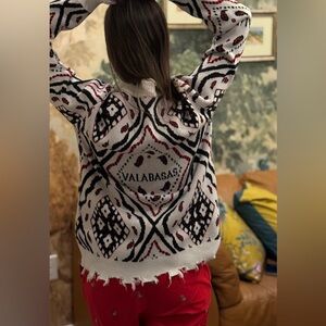 Stylish designer Valabasas cardigan featuring a bold geometric pattern and distressed hem details for a modern streetwear look. High-quality knit made from 100% cotton — comfortable, breathable, and holds its shape well.