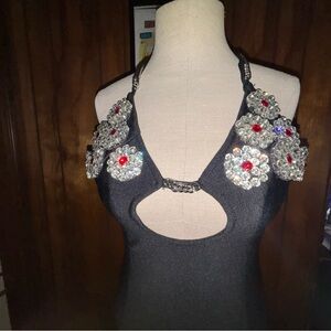 Elegant red lace dress. Features intricate lace patterns. Sleeveless with a deep V-neckline. Perfect for special occasions. Doesn’t fit mannequin obviously but zipper is normal not broken.