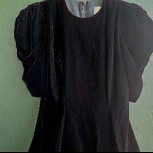 This is a vintage black velvet-like midi dress by the brand Algo (specifically Algo-ettes), a Canadian clothing label. The dress features a structured bodice with a classic A-line silhouette that flares towards the hem. It is characterized by prominent puff sleeves (also described as balloon or short puffy sleeves). While some Algo-ettes pieces date back to the mid-1970s, many of these velvet styles are from the early 1990s. I believe this dress is from the 1980s due to the Princess Diana like sleeves.