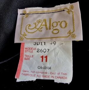 Algo-ettes was a brand manufactured in Canada and often featured union-made labels. The brand produced a wide variety of dress styles through the 1970s and 1990s, ranging from floral prairie dresses to formal evening gowns.