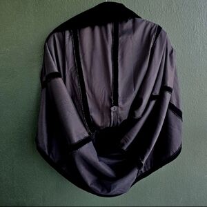 It is crafted from an acetate/nylon blend which gives the feel of a rich black velvet (easier to clean and care for than velvet with a similar feel and look). Algo dresses are sometimes noted for having a subtle burgundy shift depending on the specific model. This dress does show burgundy details in bright light but presents as black only in dimmer settings.