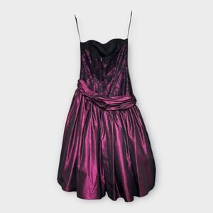 Gorgeous vintage 1980s Loralie Original prom formal dress in a size 6. Metallic sparkly purple, slightly drop waist on one side, large bow and rouching, strapless, amazing full poofy midi skirt with tulle later underneath. This dress is in pristine preowned condition. No flaws or signs of wear that I can find.