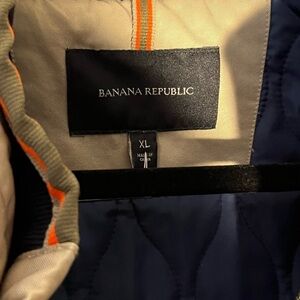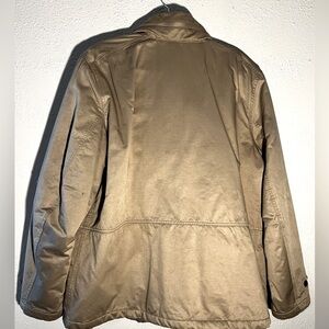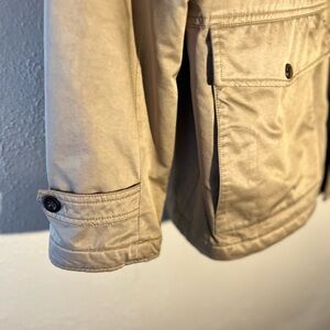 This is a Banana Republic Men's Tan Military Field Barn Coat Jacket in size XL. The outer shell material is cotton, with a cotton blend lining. It features a zip and button closure, with accents like buttons, quilted details, and zippers. The style is a military jacket with a preppy, classic look, suitable for the winter, fall, and spring seasons. It includes pockets and is designed with a nature, outdoor theme in mind.