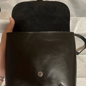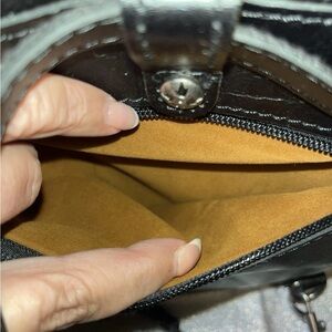 Patricia Nash VATONI black leather backpack/crossbody with embossed design. Features a buckle closure and adjustable straps.