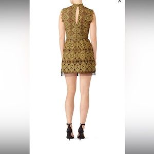 Intricate, openwork lace defines the striking drama of this regal mini dress by CATHERINE DEANE. Gold lace (100% Polyester). Hourglass. Cap sleeves. Mock neckline. Hidden back zipper with exposed button closure at neck. Partially lined. 33" from shoulder to hemline.