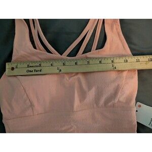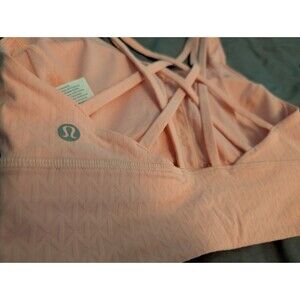 New with Tags! Lululemon Free To Be Serene Longline Bra in the beautiful Dew Pink Jacquard texture. This strappy back sports bra is designed specifically to provide light support for C/D cups, making it a highly sought-after style for those needing a bit more room than the standard yoga bra.