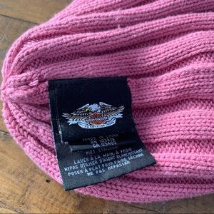 Stylish pink knit beanie. Features Harley-Davidson logo. Perfect for casual wear.