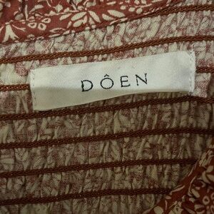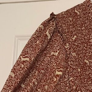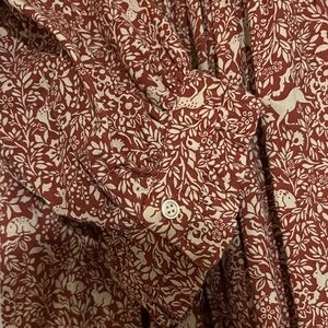 Charming mini dress with rust and cream floral folk print pattern. Features long sleeves and a ruffled hem. Sweet shoulder details and a back zipper. Some stretch to bodice. Size Large. TTS.