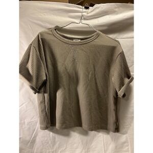 The Francesca's Blue Rain Women's Short Sleeve Boxy Soft T-Shirt in size small is a versatile and comfortable top perfect for women looking for a basic yet stylish piece. Made with a soft and breathable material, this gray/brown t-shirt features a round neckline and short sleeves, making it a classic choice for everyday wear. With a boxy fit and a brand known for quality, this t-shirt offers both style and comfort for any casual occasion.