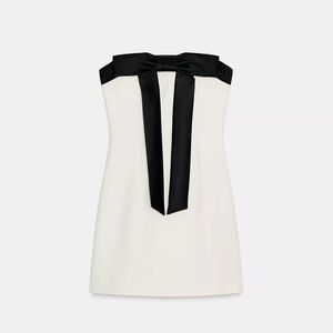 Short strapless dress with a straight-cut neckline. Fabric and bow combined in contrasting satin fabric. Interior lining. Side closure with concealed in-seam zipper.