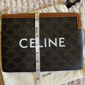 Elegant Celine clutch with bold logo. Features light and dark brown tones. Great for any occasion! NEW.