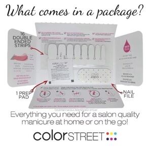 Each package of Color Street Nail Polish Strips includes 16 strips in various widths and shapes, an emory board and a pad. The nail strips go on dry, so no smudging, which is my favorite part, because I don't know about you, but I'm always messing up my nails before they dry.