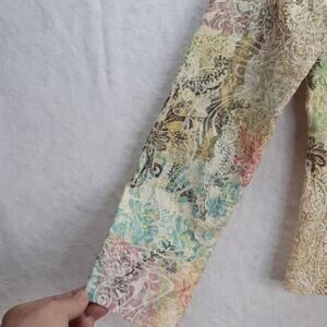 Analogy Petites Jean Style Jacket Textured Yellow Gray Coral Women's Size Petite Medium. Floral Print. Thinner and more lightweight than a denim jacket. Perfect for spring or summer. Cotton, Poly, Spandex blend so there is a little stretch.