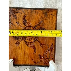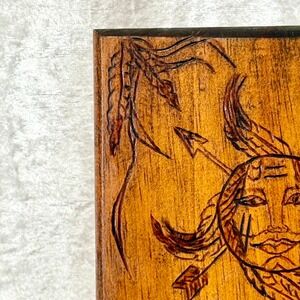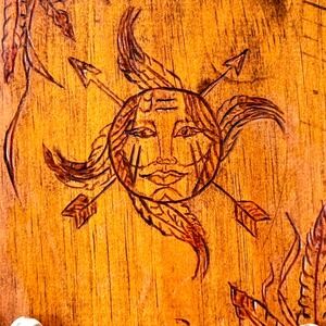 A captivating wood-burned plaque showcasing a sun face motif with intricate feather and arrow details. The artistry depicts a stylized sun with a human-like face, radiating outwards with flowing feathers and crossed arrows, evoking a Native American aesthetic. The warm, natural wood grain provides a rich backdrop, enhancing the depth and texture of the carving. The reverse side features a wire for hanging and signed "BJ 03".