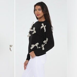 Add a touch of charm to your wardrobe with this chic black sweater adorned with stylish striped bows. Perfect for versatile styling.