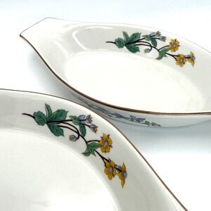 Set of two Woodhill fine bakeware Au Gratin Side bakers, each adorned with a delicate floral design. These elegant serving pieces feature a smooth, glossy finish and a charming floral pattern with yellow, green, and purple flowers. The boats are trimmed with an accent line along the rim, adding a touch of sophistication. These dishes are oven, microwave, and dishwasher safe, making them both beautiful and practical for everyday use or special occasions.