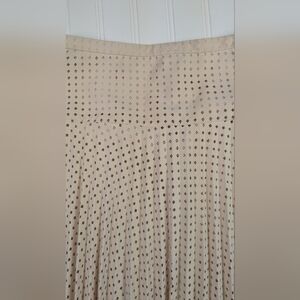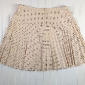 pleated mini skirt, beige cream, nude tone, perforated print, geometric cutout pattern, lightweight fabric, airy material, A-line silhouette, flared shape, casual style, daytime wear, spring summer, feminine aesthetic, soft neutral palette, chic and stylish, modern classic