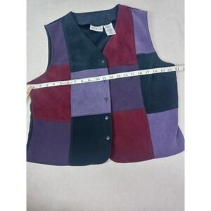 This is a stylish and unique vest by White Stag, perfect for adding a pop of color and texture to your outfit. The vest features a bold colorblock design with a patchwork look in shades of purple, black, and burgundy.