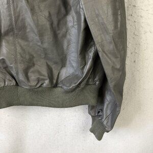 Pre-owned leather jacket with general wear and creasing throughout from use and storage. Leather surface shows light rubbing and a few small scuffs at sleeves and lower front panels, while rib knit cuffs and waistband have minor fuzzing but remain structurally sound. Interior lining is clean and intact with some wrinkling; zipper, snaps, and pockets function properly with no original retail tags or packaging included.
